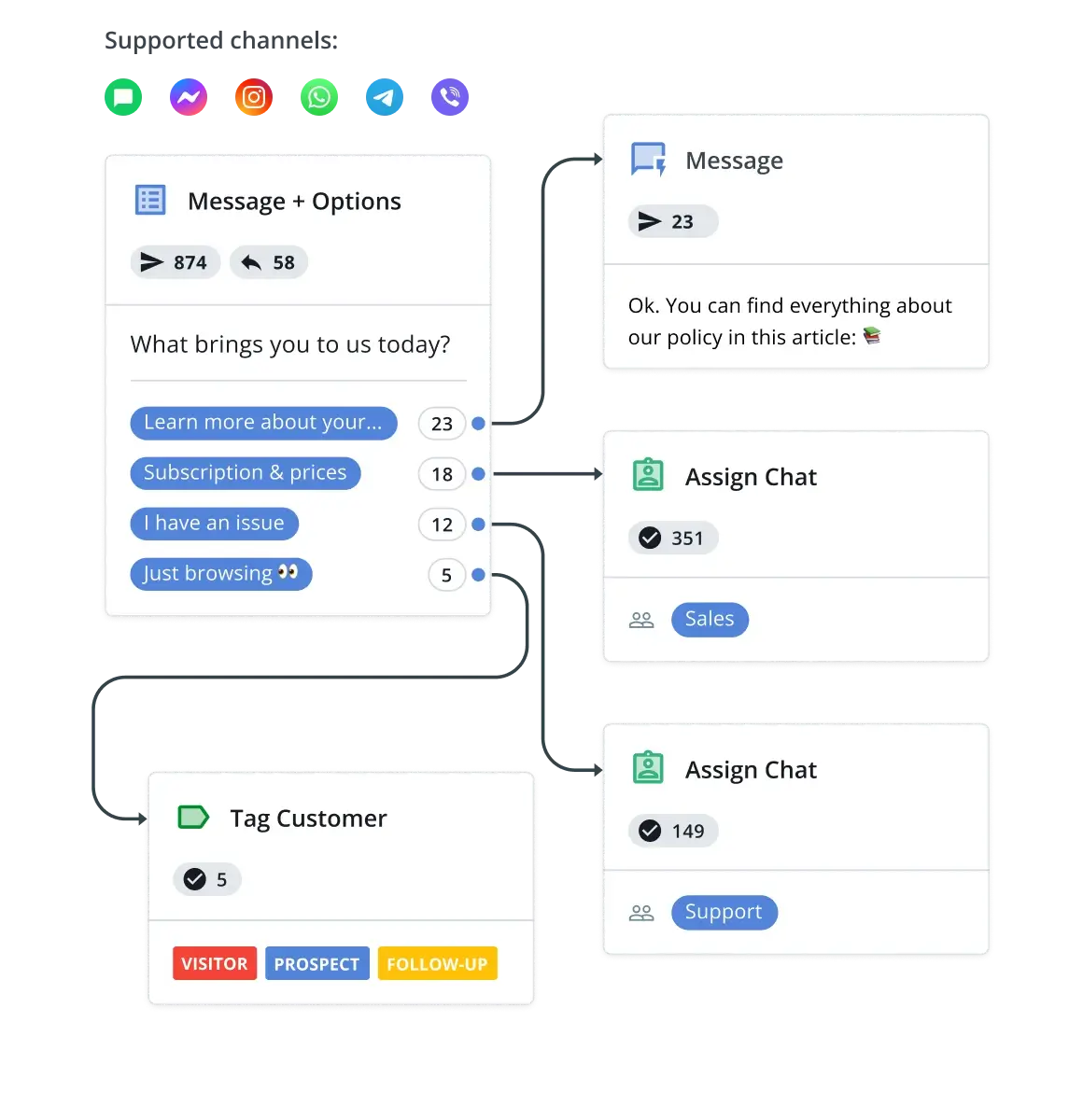 • Long gone are the days when you had to assign chats, tag customers, and ask repetitive questions. Put these trifle tasks on autopilot to save time and energy.