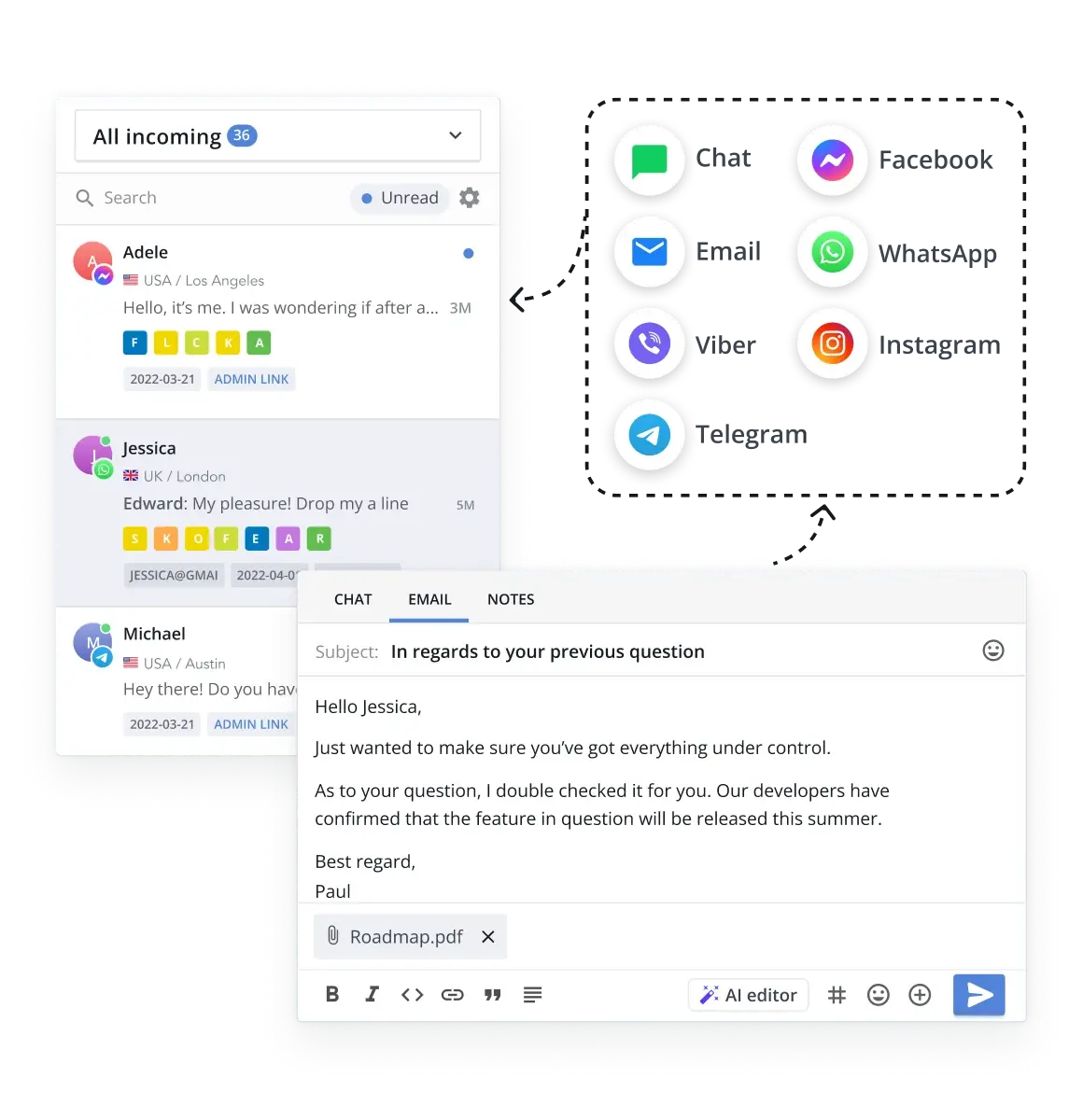 • Go multichannel. Use AI Agents across different websites, messengers, and mobile apps.