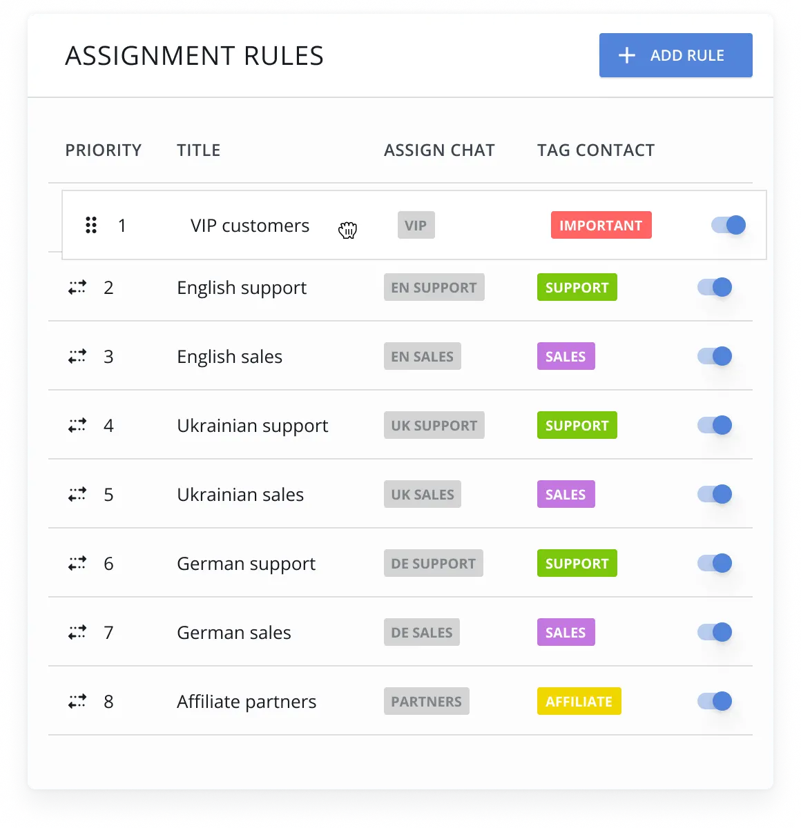 Assign conversations to your teammates or entire departments manually. Set up smart routing rules to automate this process and distribute them fair and square.