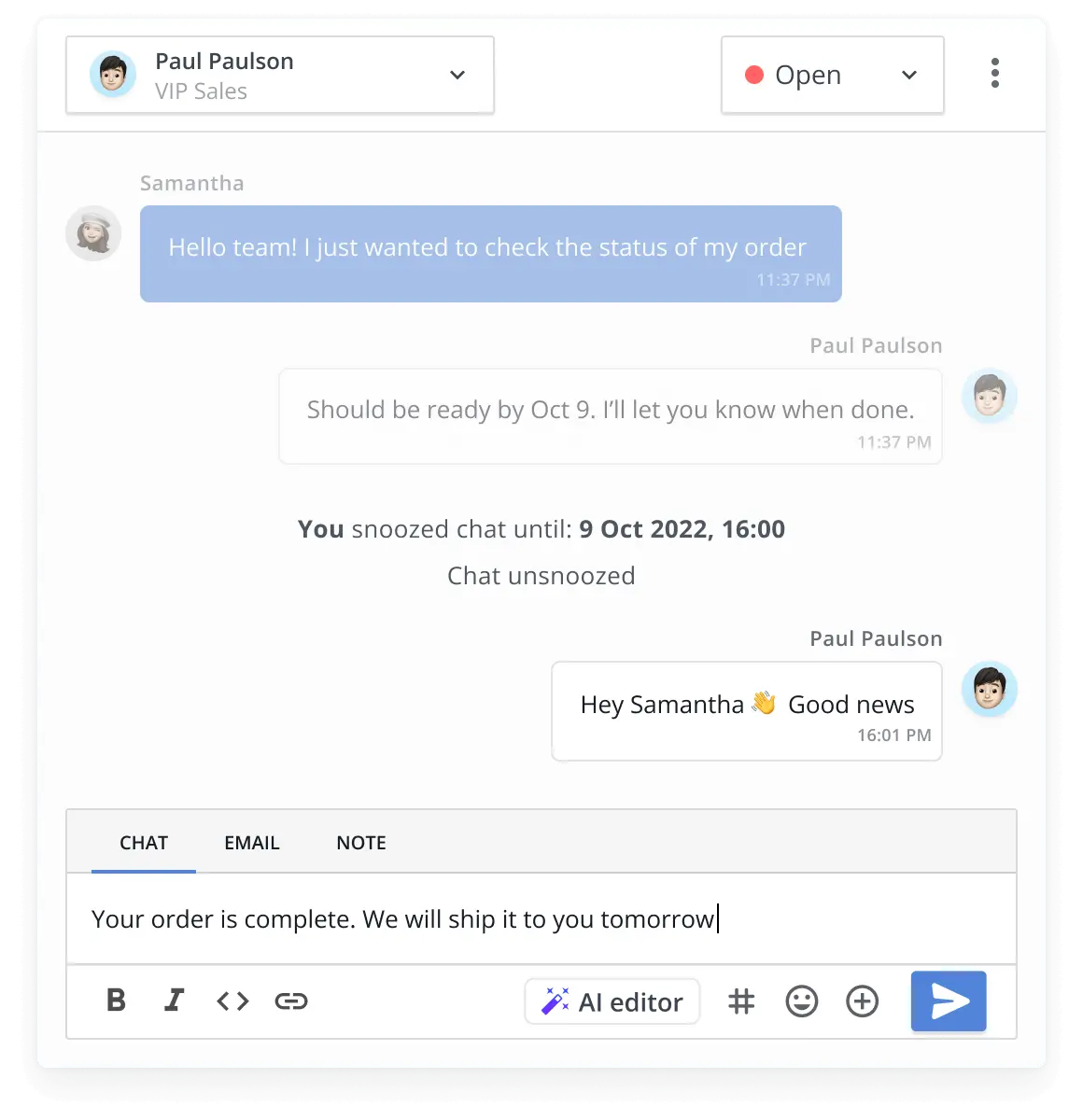Need more time to сlarify some details and follow up on the issue later? Just snooze conversations to get convenient reminders when the time is right.