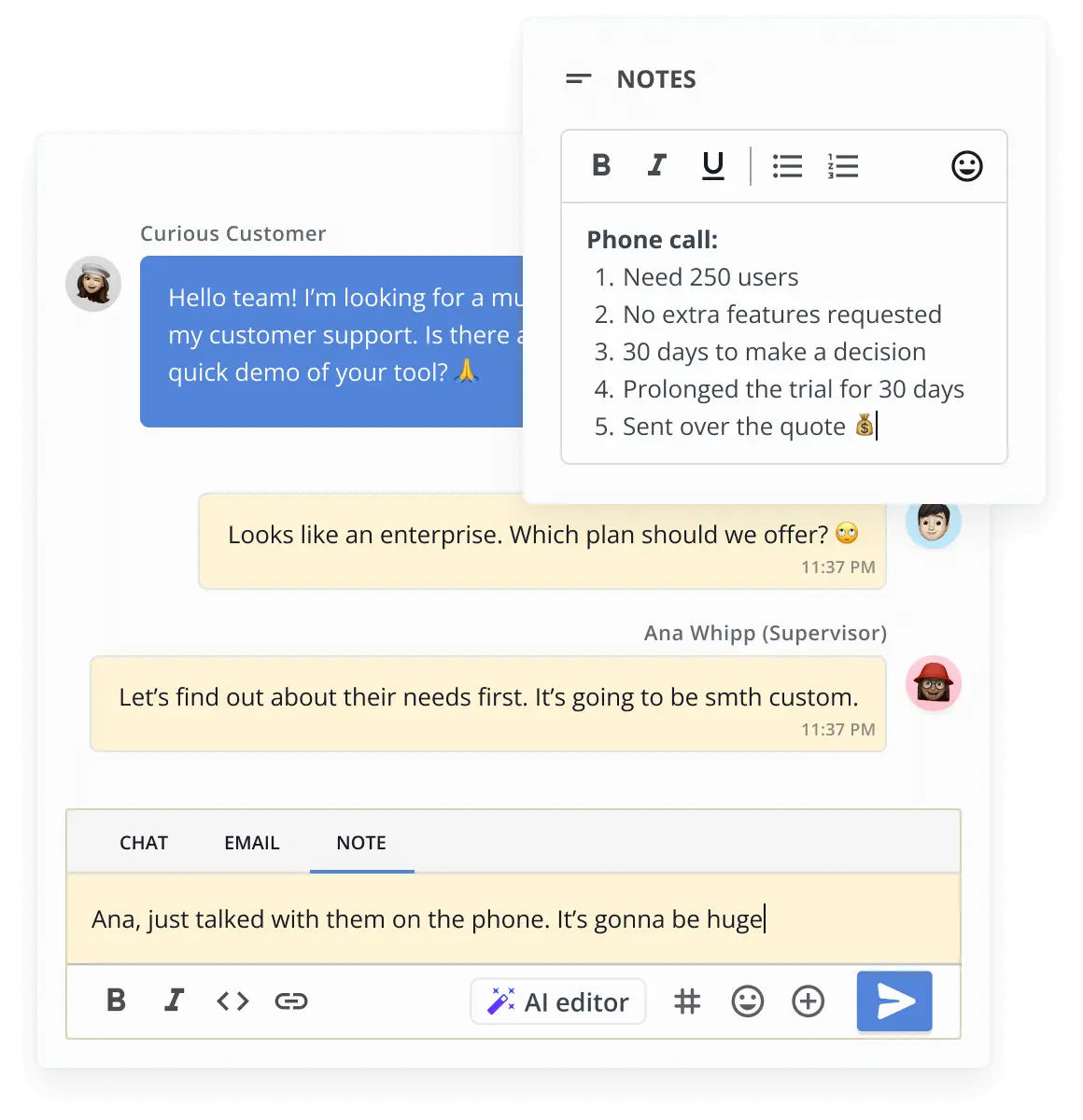 Leave private notes to indicate complex issues. These notes are only visible to other team members and will help them get the gist of a conversation in seconds.